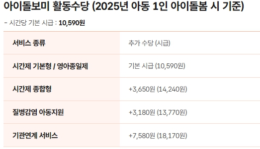 아이돌보미의 수당은 국가가 정한 기준에 따라 산정됩니다. 2025년 기준 기본 시급은 약 10,590원 수준이며, 근무 형태와 시간대에 따라 할증이 붙습니다. 주 30시간 기준 월 127만 원 내외, 주 40시간 이상 근무 시 월 160만~200만 원까지 가능합니다. 근무시간 배분과 근무유형 조합에 따라 실질적인 수입 차이가 크게 발생합니다.