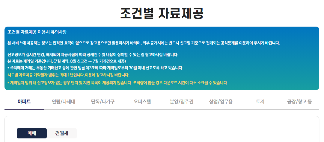 국토부 시스템에서는 매매, 전세, 월세 거래를 각각 구분해 제공합니다. 매매가 중심으로 시장 흐름을 보고 싶다면 ‘매매 실거래가’를, 전월세 시장을 확인하고 싶다면 ‘전월세 거래가’를 선택해야 합니다. 또한 특정 기간의 거래가 적을 경우, 해당 지역의 거래활동이 위축되었음을 의미할 수도 있습니다.