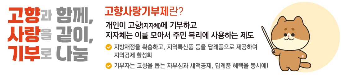 2025년 제도 개선으로 참여 문턱이 낮아지고, 세제 혜택은 커졌습니다. 이제는 누구나 온라인으로 간편하게, 그리고 투명하게 지역에 기여할 수 있습니다. 나에게 의미 있는 고향이나 관심 있는 지역을 선택해 고향사랑기부를 실천해보세요. 작은 기부가 지역의 내일을 밝히는 큰 힘이 됩니다.