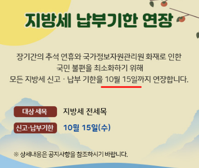 2025년에는 국가정보자원관리원에서 발생한 화재로 일부 공공 시스템에 장애가 생겼습니다. 이에 행정안전부는 국민 불편을 줄이기 위해 정기분 재산세를 포함한 모든 지방세 세목의 납부 기한을 기존 9월 30일에서 10월 15일까지로 연장한다고 발표했습니다. 따라서 납세자는 이번 연장 기한을 적극 활용해 여유를 두고 납부할 수 있습니다.