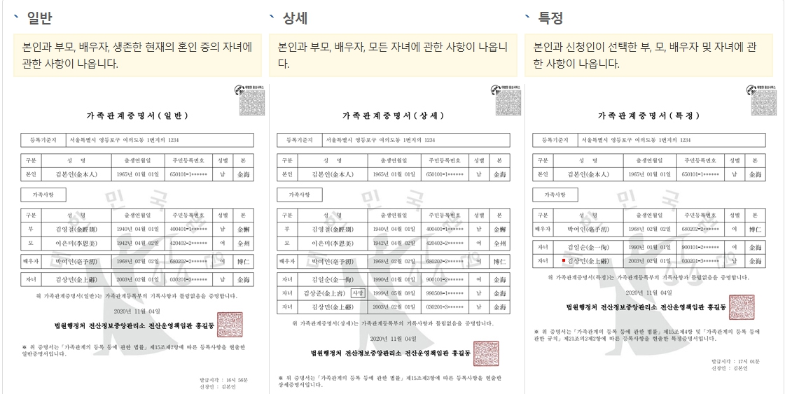 이 중 필요한 서류만 선택하여 개별적으로 발급할 수 있으며, 각각의 증명서는 본인 또는 가족의 관계를 확인하는 용도로 활용됩니다.