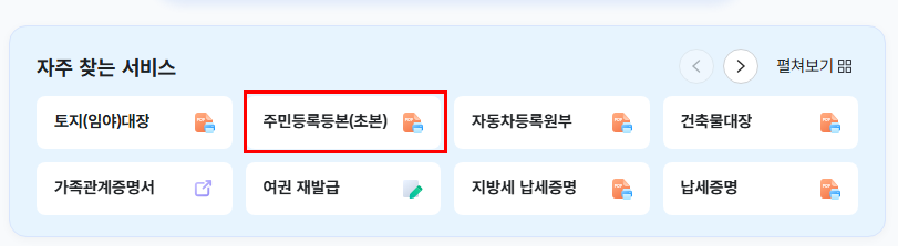 검색창에서 ‘주민등록등본’을 검색하면 발급 메뉴가 표시됩니다. 해당 메뉴를 클릭하면 발급 옵션 화면으로 이동합니다.