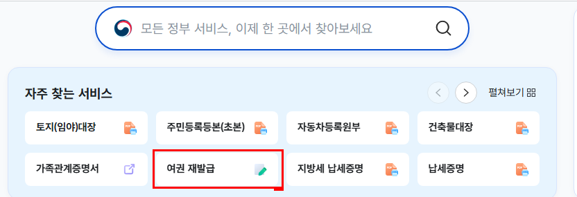 2. 검색창에 ‘여권 재발급 신청’ 입력 후 해당 서비스 페이지로 이동