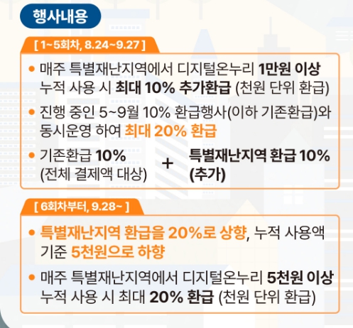 - 6회차 이후(9/28~): 특별재난지역 환급률 20% 적용 (5천 원 이상 사용 시)