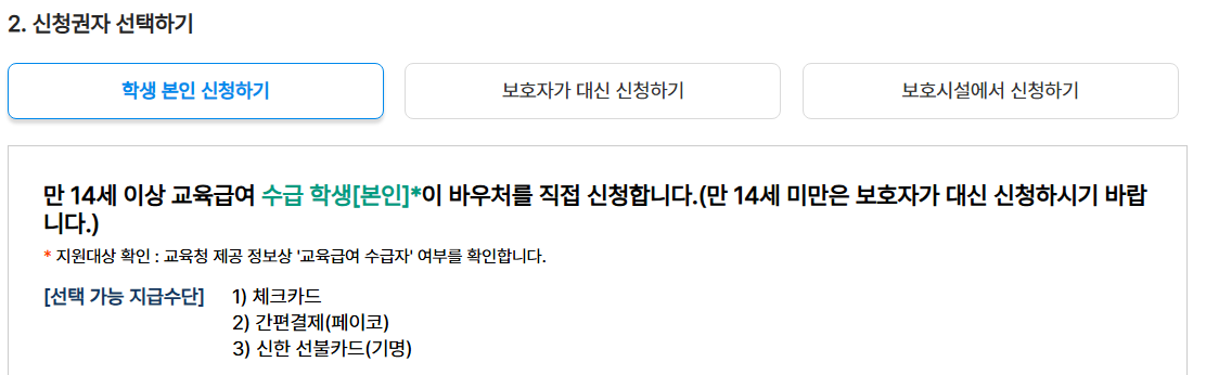 - 온라인 : e-voucher 포털에서 공동·간편 인증으로 신청 → 결제 수단 선택 → 전산 심사 → 승인 통지