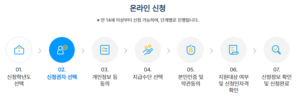 가구의 소득인정액이 기준중위소득 50% 이하인 학생이 대상입니다. 만 14세 이상 학생 본인이 신청할 수 있으며, 보호자(세대주 또는 교육급여 신청자)가 대신 신청할 수도 있습니다.