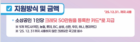 승인된 사업자는 선택한 카드사에 등록된 본인 명의 카드로 최대 50만 원 상당의 부담경감 크레딧을 지급받습니다. 해당 금액은 다음 항목의 결제 시에만 사용할 수 있습니다.