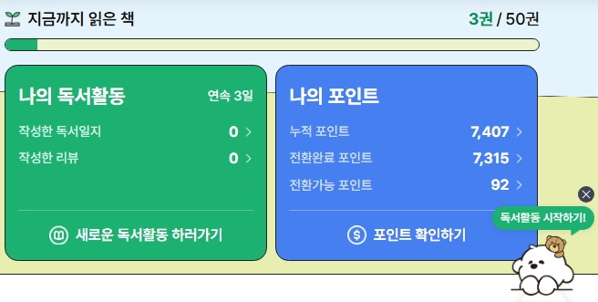 | 독서일지 | 최초 200P / 이후 50P (월 최대 31회) | 최초 200P / 이후 100P (월 최대 100회, 일 제한 10회) |