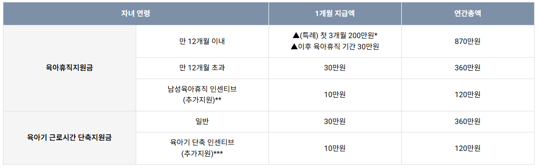 - 남성 육아휴직 인센티브: 사업장에서 첫 1~3번째 남성 육아휴직자에 대해 월 10만원 추가 지원