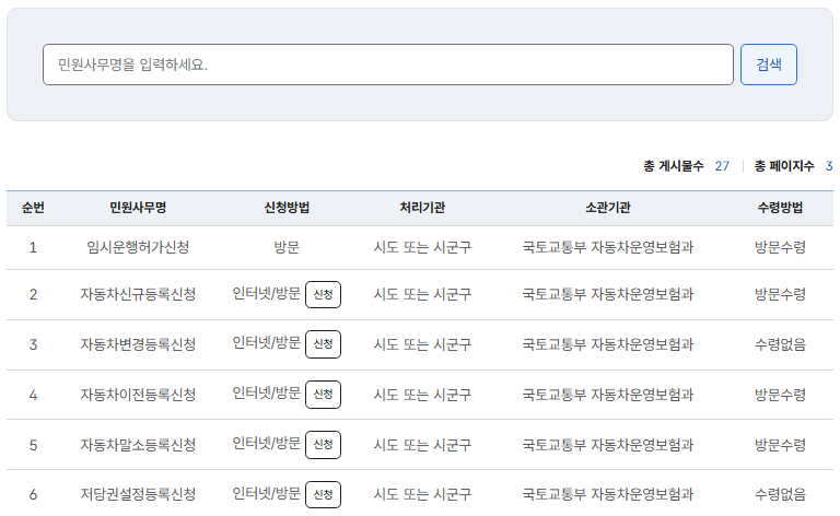 - 자동차 민원을 온라인으로 손쉽게 신청 및 조회 가능