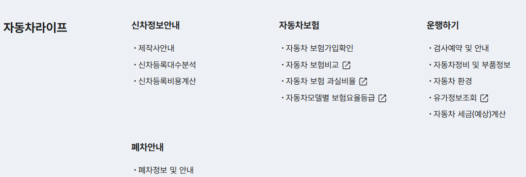 - 자동차365 홈페이지 접속 후, 상단 메뉴에서 원하는 서비스를 선택합니다.