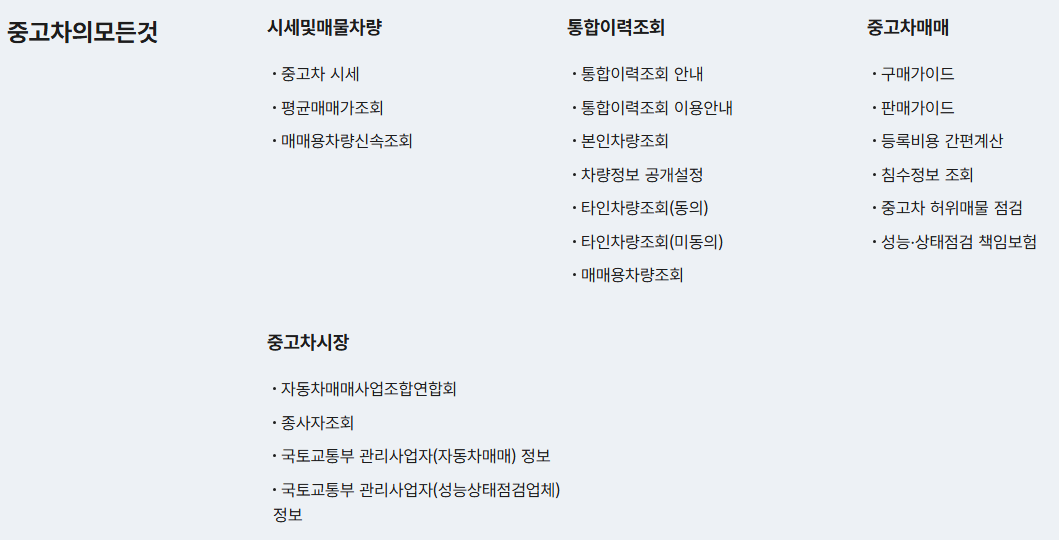 - 중고차 거래 전에는 반드시 ‘통합이력조회’ 기능을 통해 차량 상태를 검증하는 것이 안전합니다.