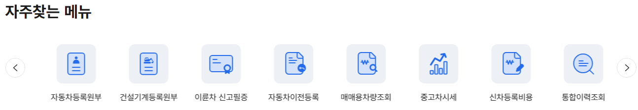 - 자동차등록원부, 이륜차 신고필증 등 자주 이용하는 메뉴는 메인 화면에서 바로 접근할 수 있습니다.