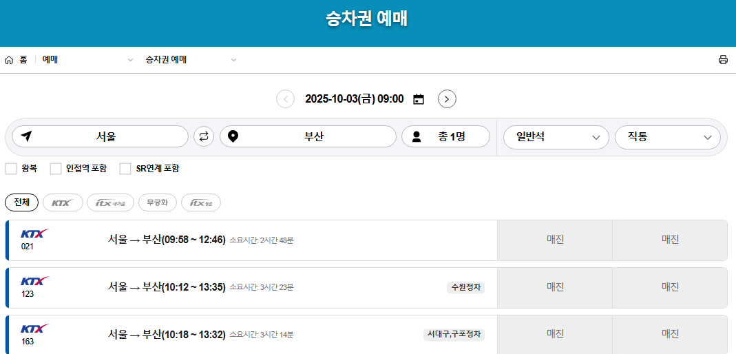 서울-부산 직통이 없더라도 서울-동대구, 동대구-부산을 나눠서 예매하면 표를 잡을 확률이 높습니다. 명절에는 직통 노선보다 구간 분할 전략이 의외로 효과적입니다. 특히 장거리 이동에서는 이 방법이 유용합니다.