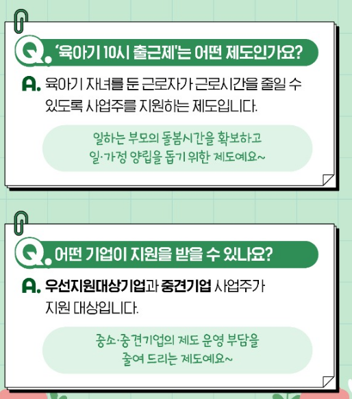 육아기 10시 출근제는 자녀를 돌보는 부모가 기존보다 한 시간 늦은 오전 10시에 출근할 수 있도록 하는 제도입니다. 임금 삭감 없이 근로시간을 하루 1시간 단축할 수 있으며, 기업에는 정부가 인건비 일부를 지원합니다. 이를 통해 근로자는 아이의 등원이나 돌봄 준비 시간을 확보할 수 있고, 기업은 일·가정 양립 문화를 실현할 수 있습니다.