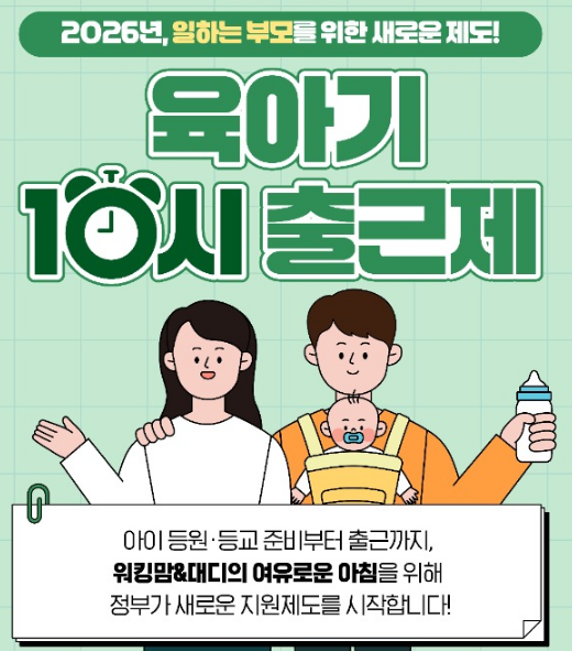 요즘 맞벌이 가정이 늘어나면서 아침 등원 시간에 부모들이 겪는 부담이 커지고 있습니다. 이러한 현실 속에서 정부는 부모가 조금 더 여유 있게 아이를 돌볼 수 있도록 ‘육아기 10시 출근제’를 도입했습니다. 이 제도는 단순한 출근 시간 변경이 아니라, 일과 가정의 균형을 위한 중요한 변화로 주목받고 있습니다.