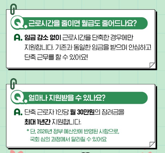 근로자는 기존보다 출근 시간을 한 시간 늦추거나, 퇴근 시간을 한 시간 앞당길 수 있습니다. 예를 들어 오전 9시 출근을 10시로 변경하거나, 오후 6시 퇴근을 5시로 조정하는 방식이 가능합니다. 근무시간 단축으로 인한 임금 손실은 정부가 일정 부분 보전하여, 실질적인 급여 감소 없이 제도를 이용할 수 있습니다.