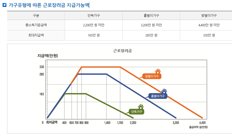 근로장려금은 가구의 형태에 따라 소득 기준이 다르게 적용됩니다. 기준은 다음과 같습니다.