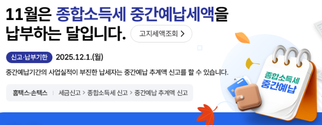 11월은 개인사업자에게 중요한 세금 일정이 있는 달입니다. 바로 종합소득세 중간예납 납부기간인데요. 국세청에서는 매년 11월 초, 종합소득이 있는 개인사업자에게 중간예납 고지서를 발송합니다. 이번 글에서는 중간예납세액의 개념부터 납부기한, 신고 방법, 분납 및 연장 제도까지 자세히 정리해드리겠습니다.