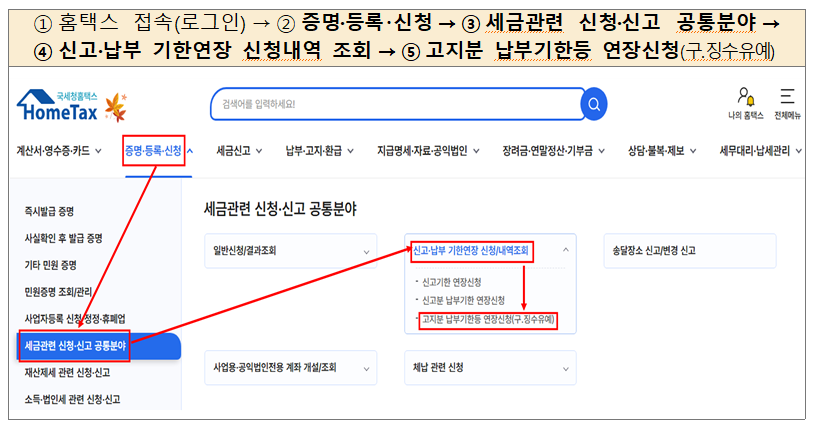 태풍, 집중호우 등 재난이나 사업 부진으로 어려움을 겪는 사업자는 홈택스 또는 세무서에 납부기한 연장신청서를 제출하면 최대 9개월까지 연장할 수 있습니다. 특별재난지역에 소재한 중소기업은 재신청 시 최대 2년까지 연장이 가능합니다.