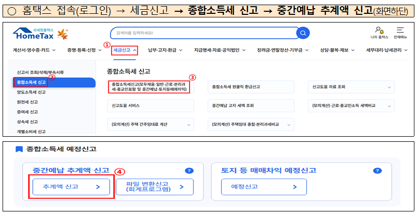 - 손택스: 로그인 → 세금신고 → 종합소득세 신고 → 종합소득세 중간예납 추계액 신고