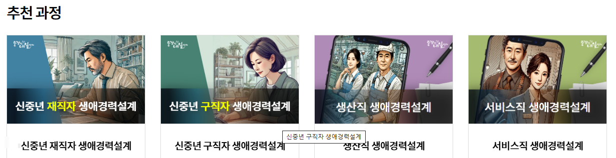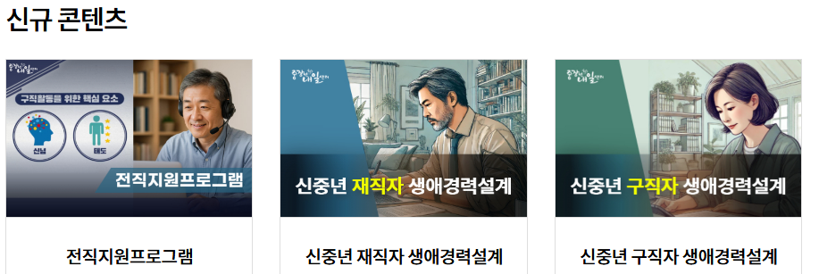 대면 참여가 어려운 경우, 전용 온라인 플랫폼을 통해 학습할 수 있도록 다양한 콘텐츠가 마련되어 있습니다. 변화관리, 스트레스 해소법, 구직전략, 대인관계, 은퇴설계 등의 주제로 구성된 13개 강의를 무료로 수강할 수 있습니다.