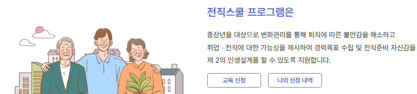 퇴직을 앞두거나 이미 퇴직한 중장년층을 대상으로 심리 안정, 구직기술, 면접 대응법 등 실질적인 전환 준비를 도와주는 ‘전직스쿨’ 프로그램이 운영됩니다. 일정은 2주에서 4주 내외로 진행되며, 집단교육과 개별 코칭이 병행됩니다.