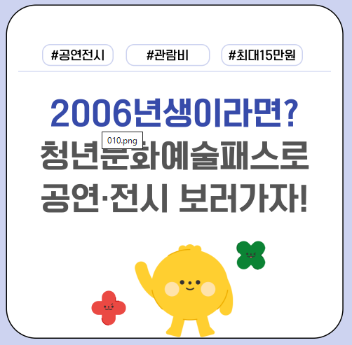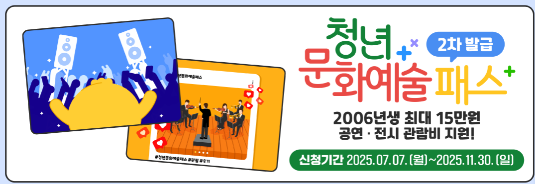 만 19세 청년이 처음 사회에 발을 내딛는 시점에 다양한 문화예술을 경험할 수 있도록 돕는 ‘청년문화예술패스’가 본격적으로 운영되고 있습니다. 이 제도는 공연·전시 관람비를 지원해 청년이 문화적 감수성을 확장하고, 적극적인 문화소비 주체로 성장하도록 지원하는 중요한 정책인데요. 아래에서 지원 대상부터 신청 절차, 예매 방법, 유의 사항까지 꼼꼼하게 정리해 드리니 신청을 준비 중이라면 끝까지 확인해 주세요.