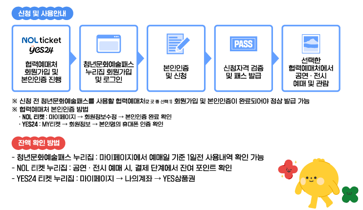 청년문화예술패스는 실물카드나 현금 지급 방식이 아닌, 협력예매처 포인트 또는 상품권 형태로 제공됩니다. 따라서 신청 전에 예매처 회원가입 및 인증 절차를 반드시 완료해야 합니다.