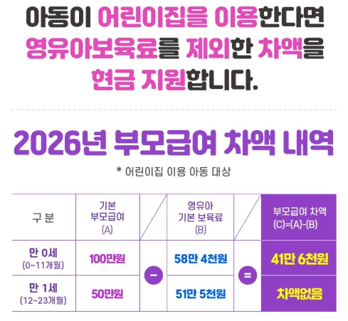 어린이집을 이용하는 아동은 부모급여가 전액 현금으로 지급되는 것이 아니라, 기본 부모급여에서 영유아보육료를 제외한 차액만 가정에 지급됩니다.